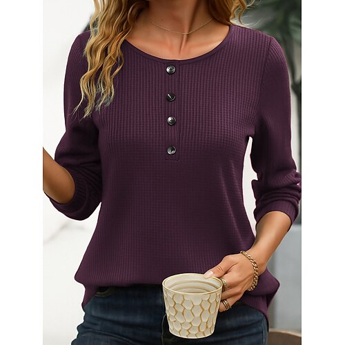 Damen T Shirt Henley Shirt Plaid Modisch Langarm V Ausschnitt Normale Oberteile Täglich Wochenende Knopf Bedruckt Gelb Rosa Blau Purpur Grün Frühling Herbst