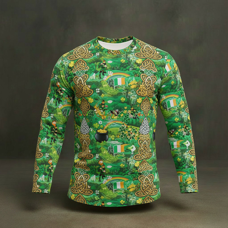 St. Patrick's Day Long Sleeve T-Shirt for Men Lucky Irish Clover Shamrock Graphic Tee 3D Print Crew Neck St. Paddy's Day Top