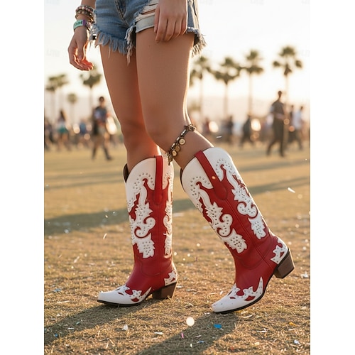 Stivali cowboy rossi da donna di Mardi Gras con rivetti - Stivali western stile festival ideali per sfilate di Carnevale feste in costume festival di strada e celebrazioni a tema
