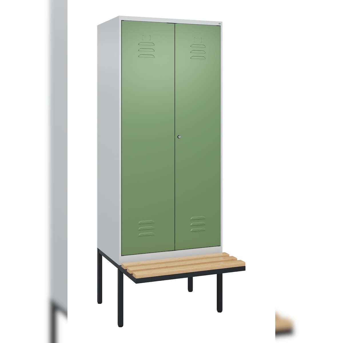 C+P Z-Spind Classic PLUS, schwebender Sitzbank aus Buche 2 Abteile, HxBxT 212x40x82cm, Sicherheitsdrehriegel, Hellgrau/Resedagrün von PROREGAL