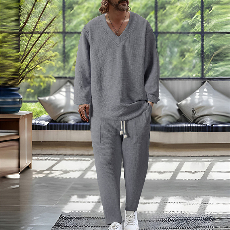 Men's T-shirt Suits Shirt and Pant Sets 2 Pieces Outfits Long Sleeve V Neck Spring Fall Plain Fashion Casual Jacquard 2 Piece Vacation Daily Wear Going out Black White Khaki Top Tee for Men