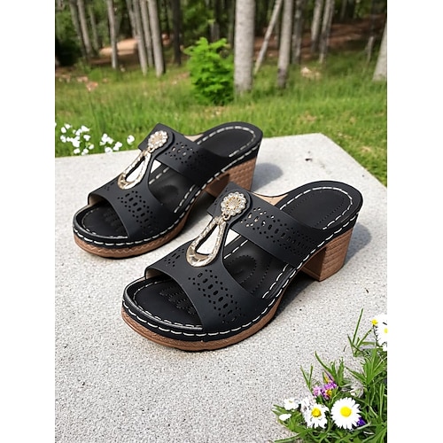 Sandali da donna con tacco grosso - design con strass traforati, fibbia decorativa retrò, suola comoda, per passeggiate all'aperto, giardino e outfit estivi casual