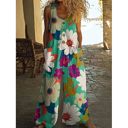 Per donna Salopette Attivo Floreale Senza Maniche Senza maniche Harem Tasca Bottoni Quotidiano Vacanza Vestibilità comoda Blu Bianco Giallo Estate