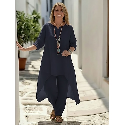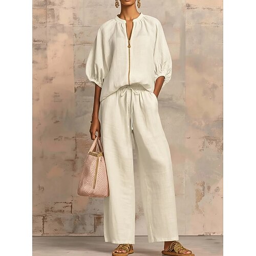 Per donna Set di Pantaloni Finto cotone e lino Manica 3/4 Girocollo Semplice Arricciato Moda Streetwear Casuale Quotidiano All'aperto Blu Nero Bianco Estate Vestibilità comoda