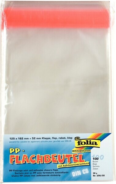 Flachbeutel aus PP. Zum Aufbewahren fertig gestalteter Grußkarten o.ä., 38 my. Mit Klappe und Adhäsionsverschluss. Inhalt: 100 Stück,