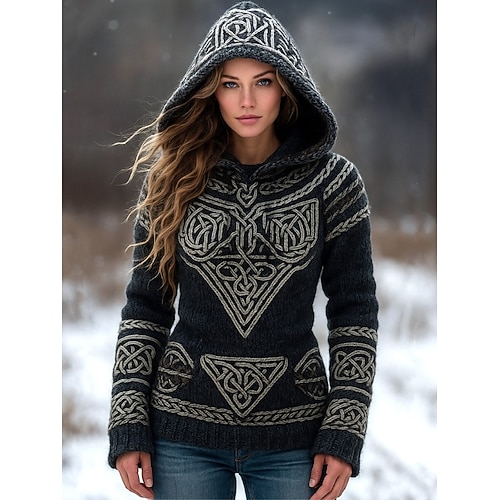 Per donna Maglione Fair Isle Vintage Casual Con Cappuccio Con cappuccio Manica Lunga Top Regolari Maglia All'aperto Nero Bianco Primavera Autunno