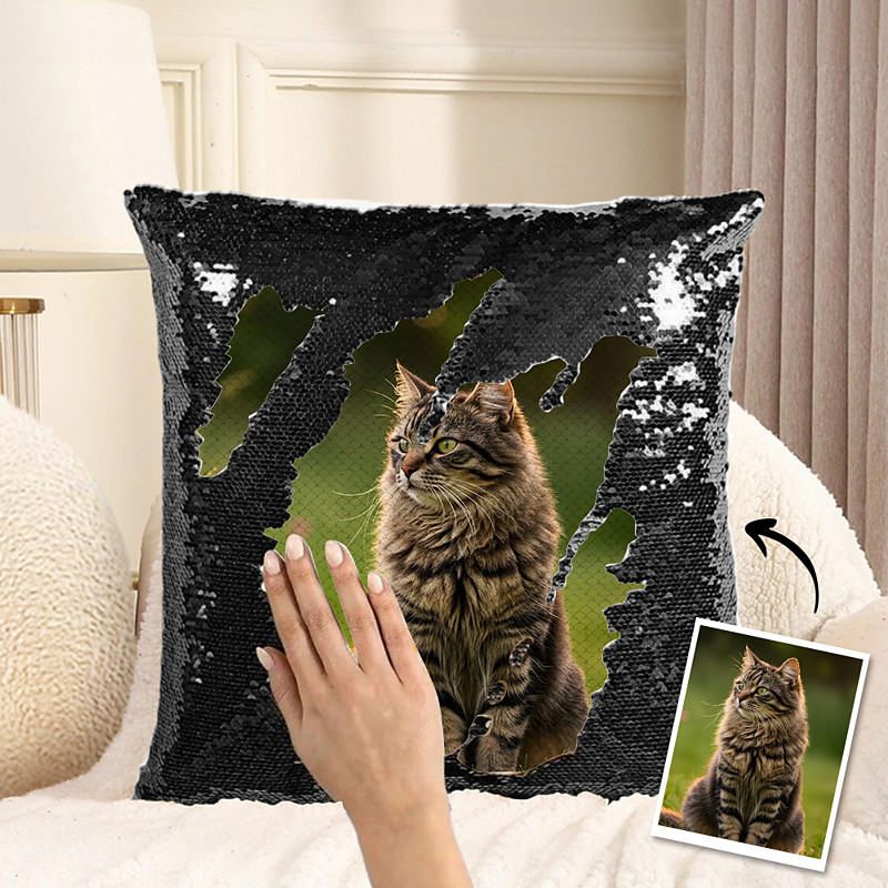 Custom Cat Photo Magic Sequin Pillow Personalized Reversible Throw Pillowcase with Your Pet Picture Gift for Cat Lovers