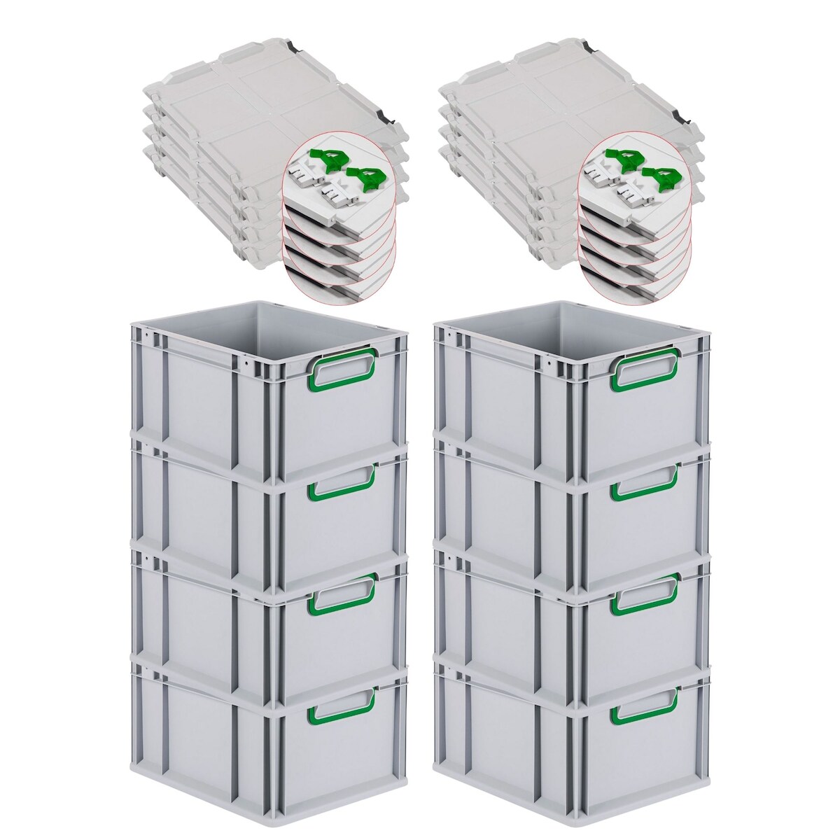 PROREGAL 8x Eurobox NextGen Color mit Scharnierdeckel & Verschlüssen | HxBxT 22x30x40cm | 20 Liter | Griffe grün geschlossen | Glatter Boden