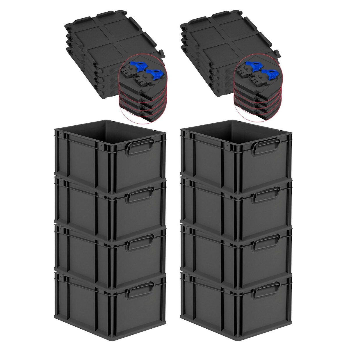 PROREGAL SuperSparSet 8x Eurobox NextGen Grip mit Scharnierdeckel & blauen Verschlüssen, HxBxT 22x30x40cm, 20L, Schwarz, Griffe zu, Eurobehälter