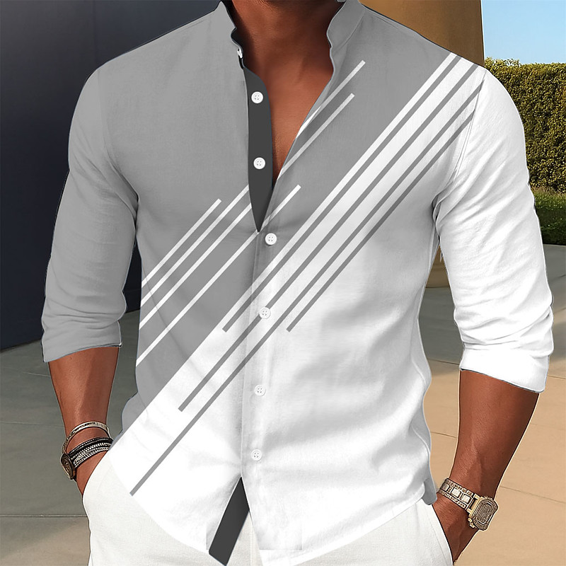 Men's Geometric Line Shirt Stand Collar Shirt Long Sleeve Business Casual Formal Dailywear Spring Fall Mandarin Collar Band Collar 3D Print Button Up Shirts Blue Green Khaki Gray