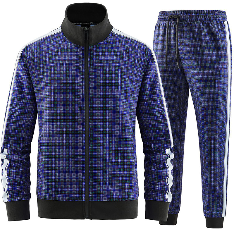 Men's Plaid Geometrical 2pcs 3D Sweatshirt Sets Tracksuit Zip Up Sweatshirts Long Sleeve Long pants Stand Collar Casual Daily Outdoor Vacation Athletic Zip Up 3D Print Spring Fall Blue Brown Green