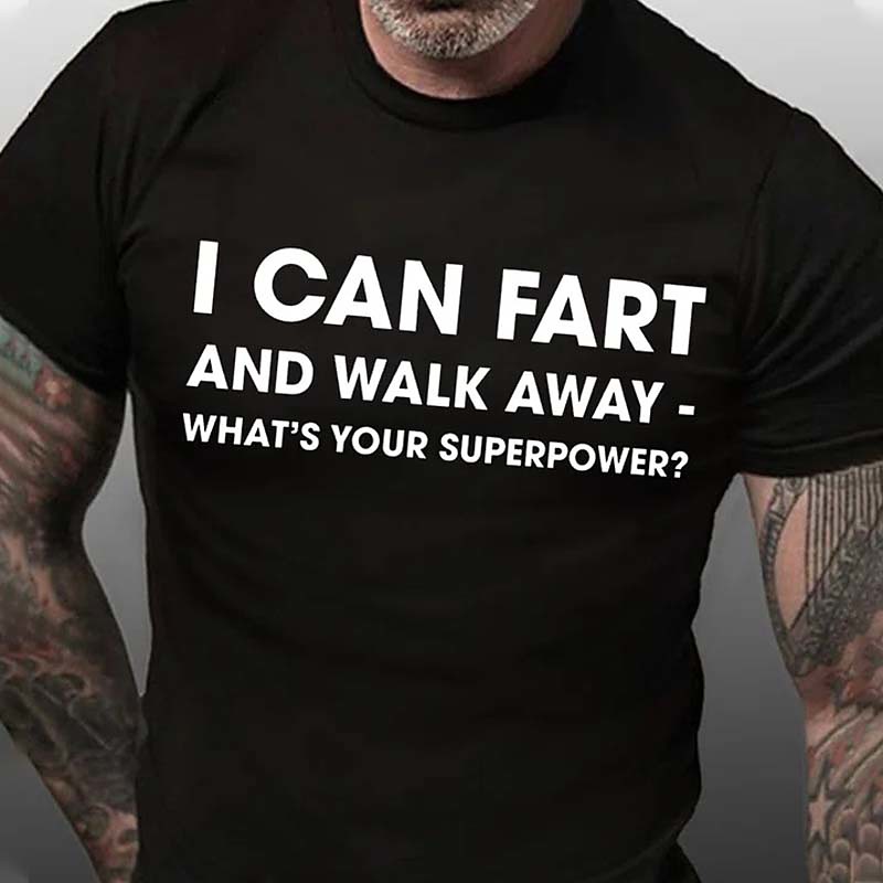 Men's Funny Graphic T-Shirt: 'I Can Fart And Walk Away - What's Your Superpower?' Short Sleeve Humor Tee for Lifestyle Gag Gifts