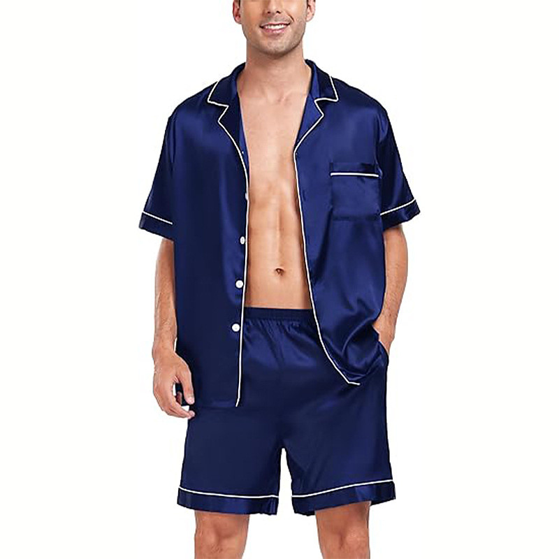 Men's Sleepwear Pajama Set Pajama Top and Shorts 1 set Plain Fashion Stylish Classic Home Daily Bed Polyester Comfort Breathable Soft Lapel Short Sleeve Shirt Shorts Button Elastic Waist Summer Black
