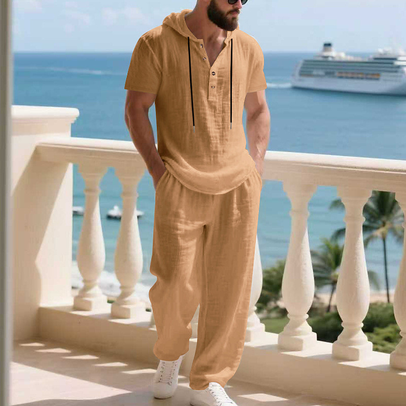 Men's T-shirt Suits Shirt and Pant Sets 2 Pieces Outfits Short Sleeve Hooded Summer Spring Plain Fashion Casual Drawstring 2 Piece Buttons Vacation Daily Wear Going out Black White Yellow Top Tee for