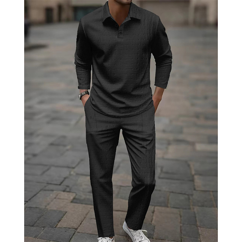 Men's T-shirt Suits Shirt and Pant Sets 2 Pieces Outfits Long Sleeve Lapel Spring Fall Plain Fashion Casual Jacquard 2 Piece Vacation Daily Wear Going out Black White Khaki Top Tee for Men