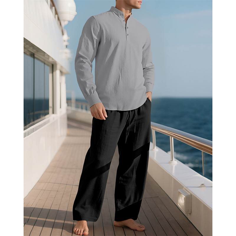 Men's Linen Shirt T-shirt Suits Shirt and Pant Sets 2 Pieces Outfits Long Sleeve Stand Collar Spring Fall Plain Fashion Casual 2 Piece Vacation Daily Wear Going out Black Khaki Black Navy Blue Top