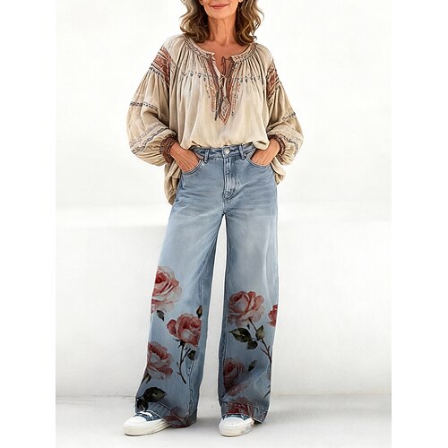 Per donna Gamba larga Chinos Vacanza Vintage Stile Etnico Lunghezza intera Vita Alta Floreale Grafico Tasca Stampa Comodo Morbido Confortevole Micro-elastico All'aperto Vacanza Streetwear Blu
