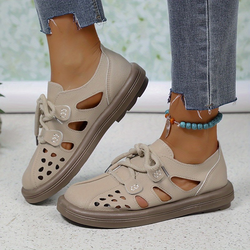 Women's White Cutout Lace-Up Faux Leather Flats – Breathable Casual Walking Shoes for Summer, Travel Everyday Wear
