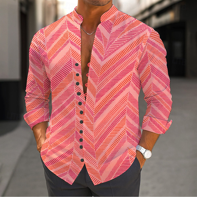 Men's Gradient Chevron Shirt Stand Collar Shirt Long Sleeve Casual Vacation Daily Wear Going out Spring Fall Mandarin Collar Band Collar Button-Down Linen Like Shirt Pink Green Khaki