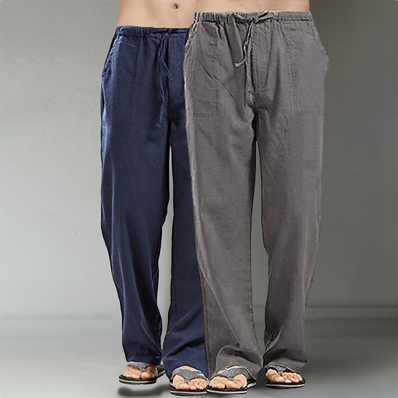 Men's Linen Pants Trousers Summer Pants Baggy Pants Beach Pants Drawstring Pocket Straight Leg Plain Comfort Breathable Full Length Daily Streetwear Fashion Casual / Sporty Loose Fit BlackNavy Blue