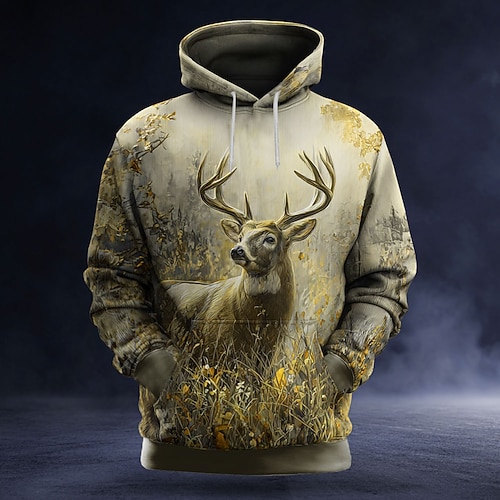 Herren Hirsch Kapuzensweatshirt Pullover Mode Klassisch 3D Langarm Rundhalsausschnitt Outdoor Jagd Gelb Rote Braun Grau Kordelzug Herbst Winter Designer S M L XL XXL XXXL