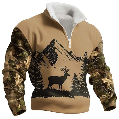 Herren Hirsch Fleece Pullover Mode Lässig 3D Jagd Stehkragen Viertelreißverschluss Outdoor Streetwear Urlaub Geschenk Braun Khaki Dunkelgray Grau Halber Reißverschluss Herbst Winter Designer S M L XL
