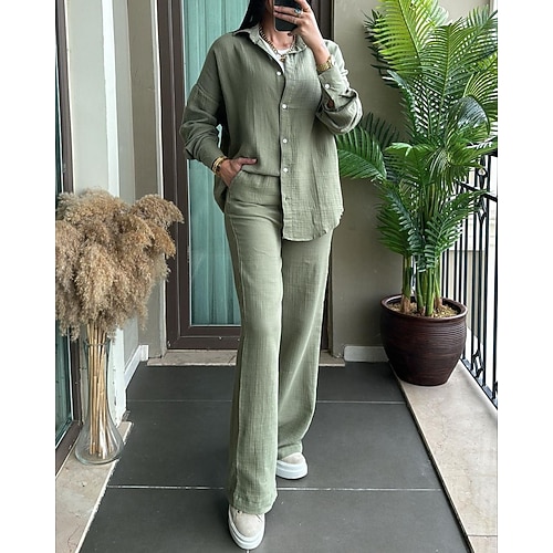 Per donna Attivo Moda Camicie di cotone e lino Blusa Set di Pantaloni Manica Lunga Scollo a V Tinta unica All'aperto Weekend Nero Bianco Rosa Estate Vestibilità regolare