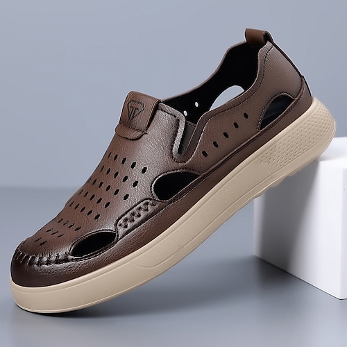 sandali da uomo in similpelle marrone con punta chiusa, design traspirante e traforato con suola antiscivolo, ideali per passeggiate estive, all'aperto e per uso casual