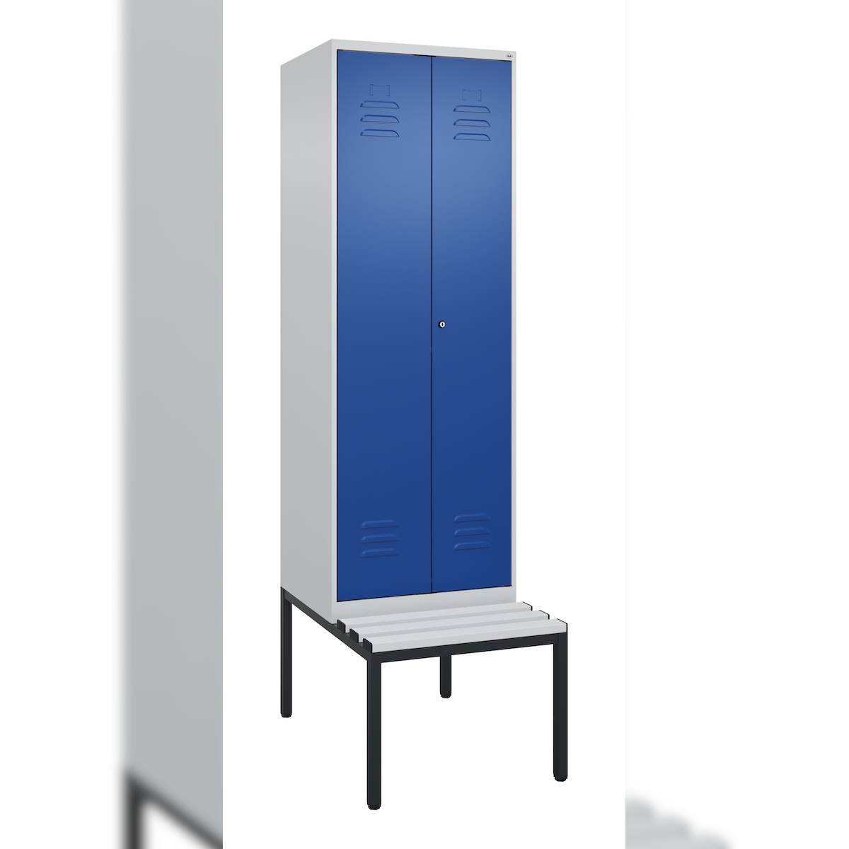 C+P Spind Classic PLUS, Kunststoff schwebende Sitzbank, 2 Abteile, HxBxT 212x80x82cm, Zylinderschloss, Hellgrau/Enzianblau von PROREGAL