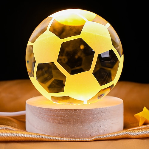 Lampada a sfera di cristallo 3D da 6 cm con disegno sportivo inciso: calcio, basket, badminton, tennis, luce notturna a LED alimentata tramite USB con base in legno per camera da letto, feste,