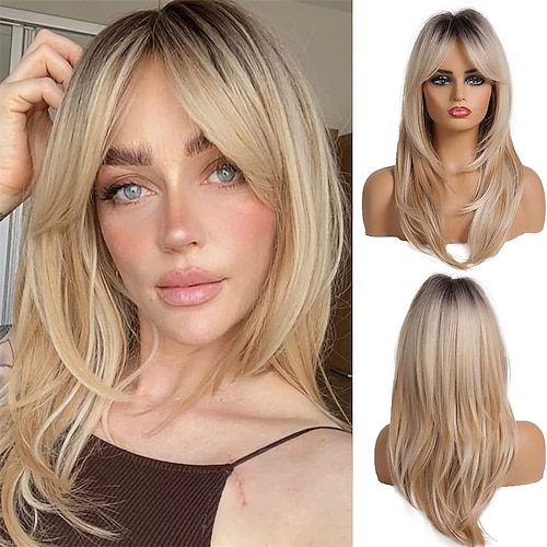 lange 613 blonde perücke mit pony gerade perücken für damenhitzebeständige geschichtete kunstfaserperücken für den täglichen gebrauch