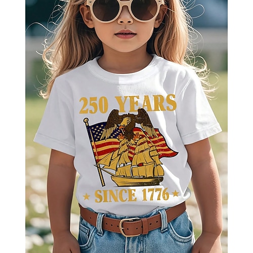 100% Cotone Bambini Ragazze Nero Bianco Grafico Nave 250° anniversario Bandiera americana per bambini Maglietta Girocollo Manica Corta Vacanza Sport Outdoor Abbigliamento Quotidiano Sport e Outdoor
