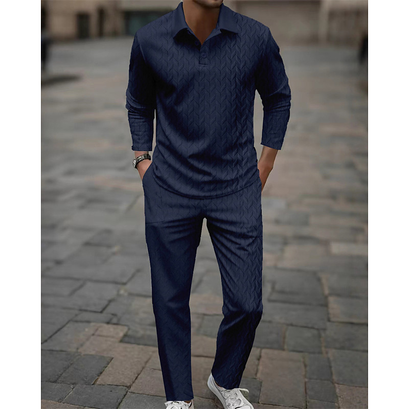 Men's T-shirt Suits Shirt and Pant Sets 2 Pieces Outfits Long Sleeve Lapel Spring Fall Plain Fashion Casual Jacquard 2 Piece Vacation Daily Wear Going out Black White Navy Blue Top Tee for Men