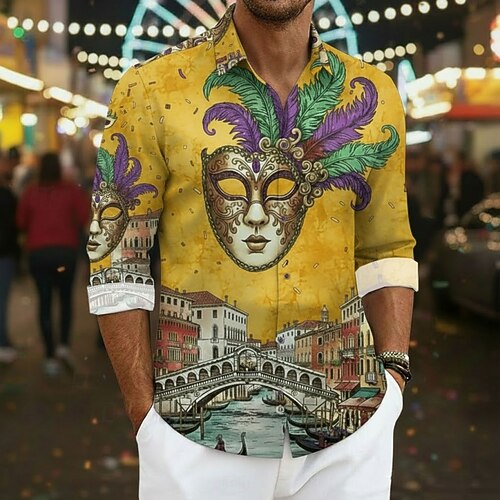 Carnevale Per uomo Grafico Maschera con piume Camicia Camicia button-down Camicia da Spiaggia Manica Lunga Hawaiano Casual Confortevole Vacanza Ferie Martedì grasso Estate Primavera Collo ripiegato