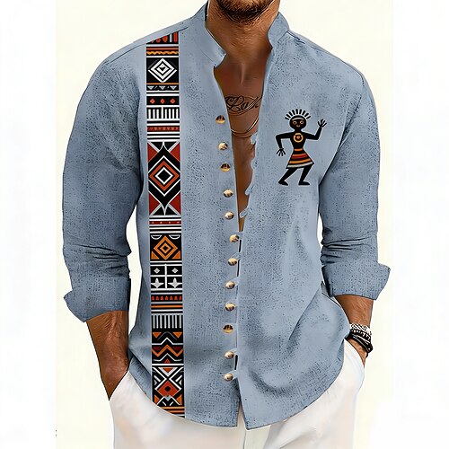 Herren Geometrisch Ethik / Afrikanisch Indigene Völker Hemd Stehkragenhemd Langarm Vintage-Retro Lässig Urlaub Frühling Herbst Mandarinkragen Stehkragen Button-Down Leinenähnliches Hemd Blau Gelb