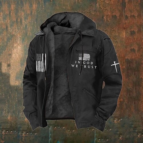 Per uomo Felpa con cappuccio a zip intera Giacca in Pile Felpa con cappuccio in pile Nero Marrone Grigio scuro Con Cappuccio Lettera Croce Bandiera Americana Cerniera Tasca Casuale Quotidiano Uscire