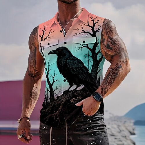 Herren Krähe Farbverlauf Raven Hemd Knopfhemd Ärmelloses Shirt Ärmellos Dunkler Gothic-Stil Outdoor Lässig Sommer Frühling Umlegekragen 3D-Druck Zwei Fronttaschen Blau Orange Grün