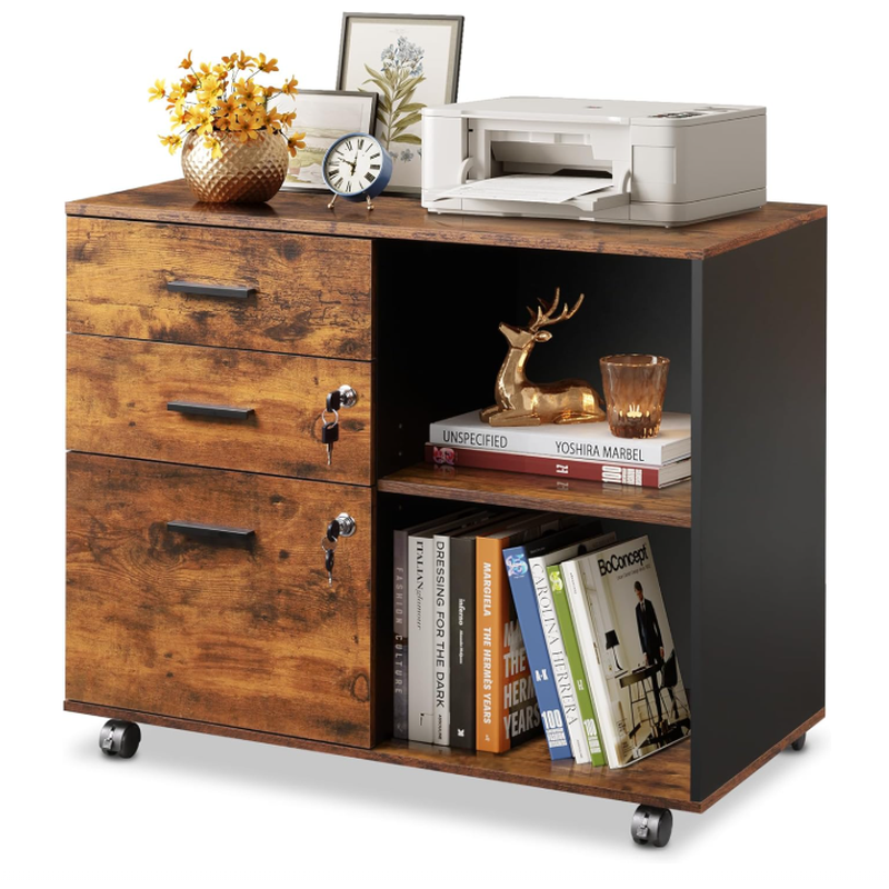 DEVAISE Rollcontainer mit 3 Schubladen und offenen Fächern, mobiler Aktenschrank mit Rollen, Druckertisch für DIN A4/Legal/Letter, abschließbarer Schrank für Büro und Homeoffice, Retro Braun