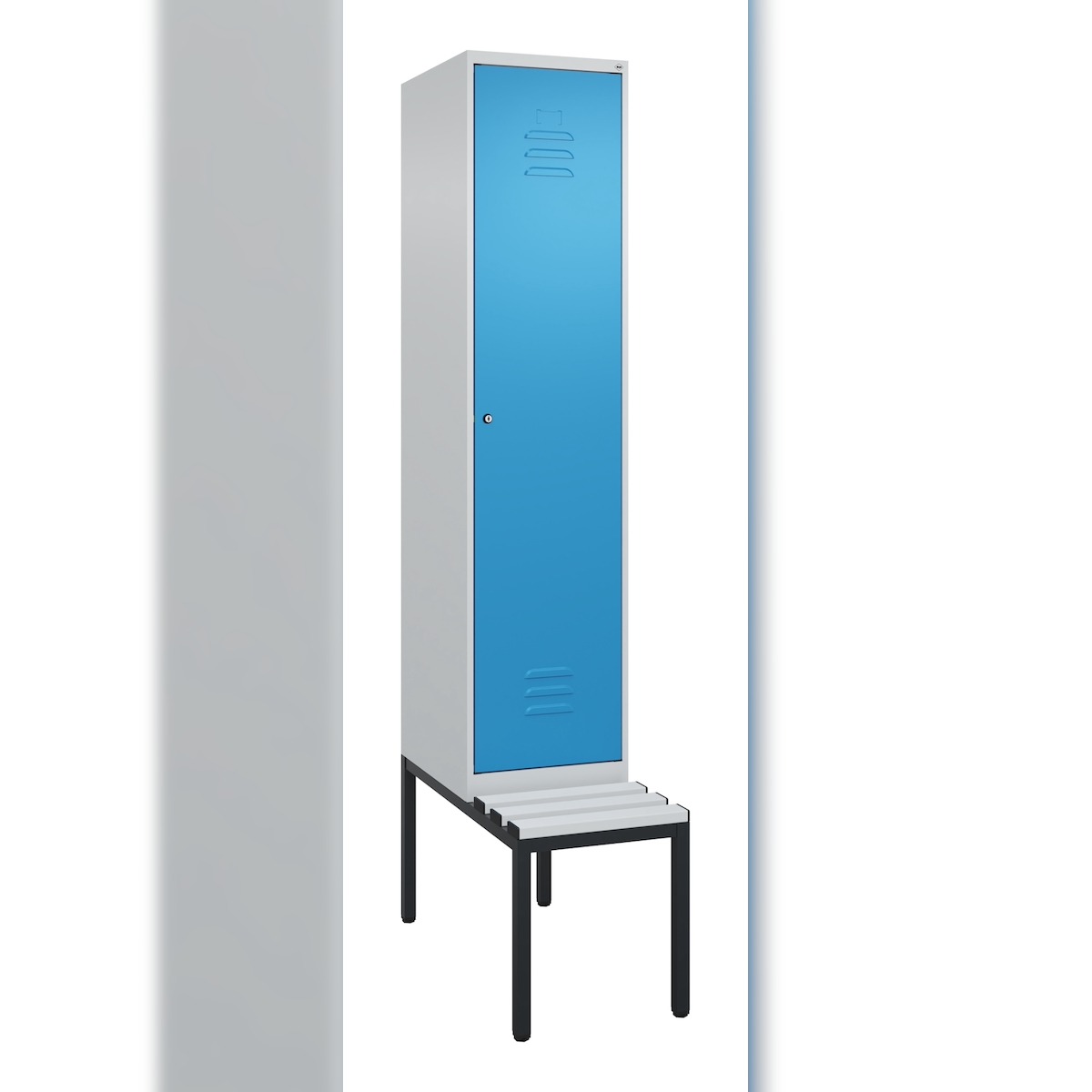 C+P Spind Classic PLUS, Kunststoff untergebaute Sitzbank, 1 Abteil, HxBxT 212x40x82cm, Zylinderschloss, Hellgrau/Lichtblau von PROREGAL