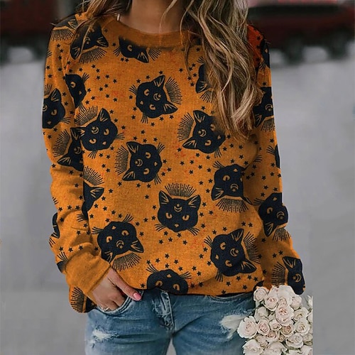 Per donna Felpa Pullover Felpe Gatto Zucca Streetwear Casual Manica Lunga Girocollo Top Regolari Streetwear Ferie Uscire Stampato Nero Giallo Verde scuro Arancione Verde Autunno Inverno