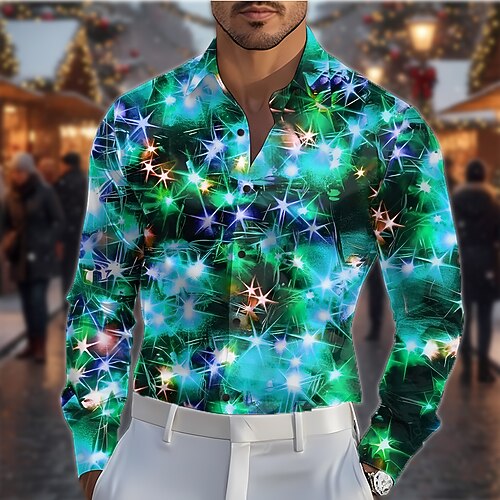 Weihnachten Herren Weihnachtslicht Hemd Satinhemd Kleidhemd Langarm Modisch lässig Party Ferien Frühling Herbst Umlegekragen 3D-Druck Hemden mit Knopfleiste Rote Blau