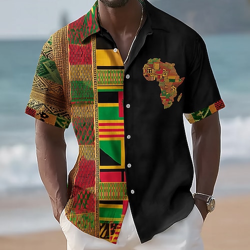 Juneteenth Herren Stammes Karte Ethik / Afrikanisch Hemd Sommerhemd Knopfhemd Kurzarm Vintage-Retro Ferien Sommer Frühling Umlegekragen 3D-Druck Hemden mit Kragen Blau Rote Khaki Schwarz