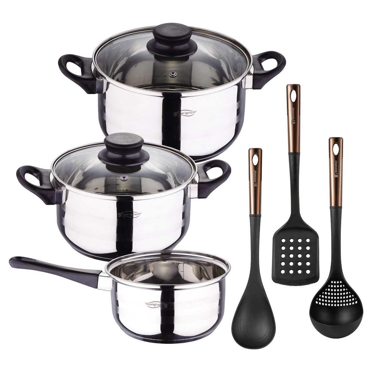 BERGNER - 5-teiliges Kochgeschirr 16/18/20 cm aus Edelstahl induktionsgeeignet mit 3 Küchenutensilien aus schwarzem und kupferfarbenem PBT