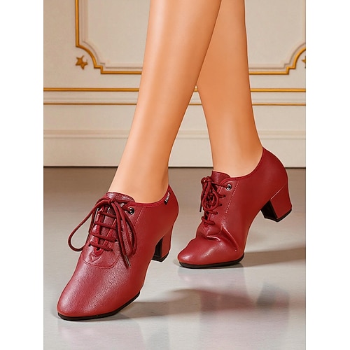 Scarpe da ballo latino professionali da donna - design con punta aperta e lacci, morbida similpelle, tacco medio stabile, stile traspirante per ballerini di ballo da sala e salsa allenamento pratico