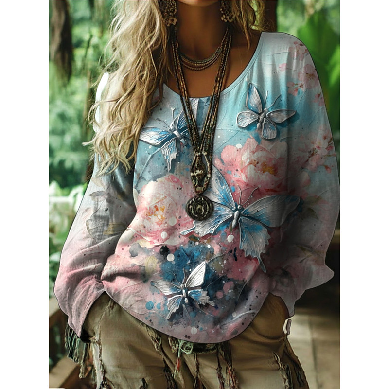 Women's Boho T-shirt T Shirt Tee Top Floral Vintage Ethnic Casual Long Sleeve Crew Neck Regular Tops Daily Weekend Vacation Wear Print Blue Summer Spring Fall