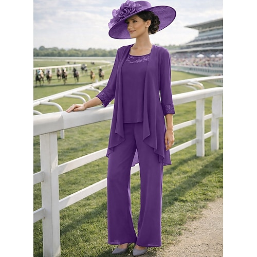 Tuta Completo Pantalone Tre Pezzi Lunghezza al pavimento Abito da cerimonia per signora Senza Maniche Scollo a Barca Elegante Taglie Forti Con Stola Ospite di nozze Chiffon Abiti con Giacca con Tinta