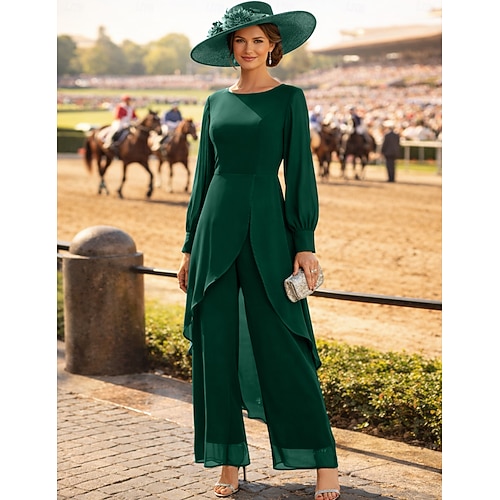Completo Pantalone Asimmetrico Abito da cerimonia per signora Manica Lunga Girocollo Elegante Formale Ospite di nozze Serata Formale Chiffon con Tinta unita