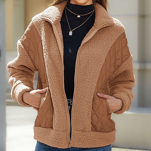 Per donna Cappotto Invernale Cappotto Teddy Caldo Confortevole Patchwork Cerniera Tasca Moda Casual Tinta unica Vacanza Streetwear Casuale Abbigliamento quotidiano Regolare Collo ripiegato