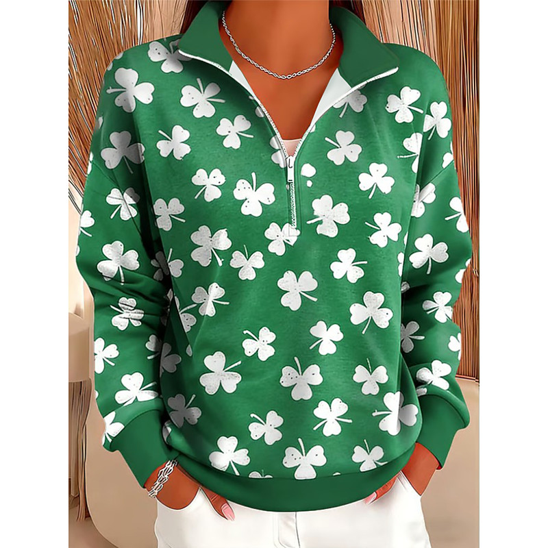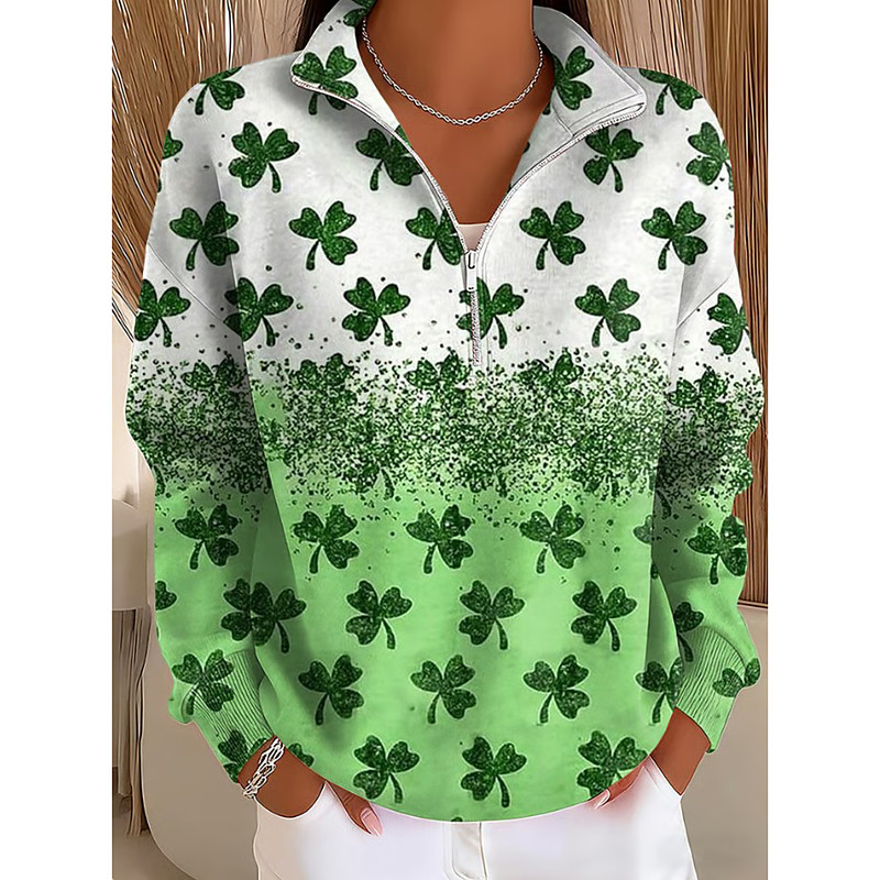 St Patrick's Day Lucky Women's Pullover Sweatshirt Floral Graphic Shamrock Casual Long Sleeve Half Zip Regular Tops Casual Holiday Zipper Green Spring Fall