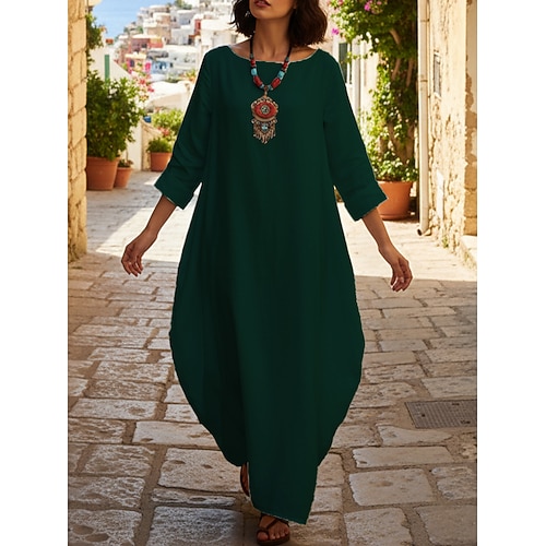 Per donna Abito maxi Finto cotone e lino Abito Boho Vestito a caftano Vestito Casual Elegante Moda Moderno All'aperto Vacanza Uscire Vestibilità comoda Semplice Manica Lunga Girocollo Blu Nero Bianco